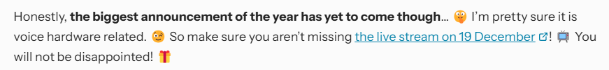 Mit dem letzten HA-Release wurde nun für den 19.12. noch ein Hardware-Release (oder zumindest weitere Infos hierzu) angekündigt, bei dem es um „Voice hardware“ gehen soll: