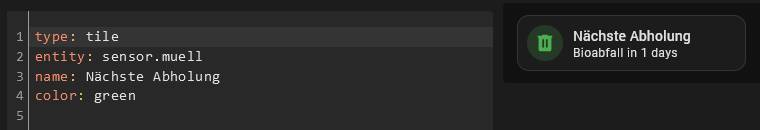 Ich betreibe mein Dashboard in der Ansichtart „Sektionen (experimentell)“, dort benutze ich deinen Müllsensor, um mir die nächste Abholung anzuzeigen. Innerhalb dieser Kachel kann ich die Farbe manuell auswählen.