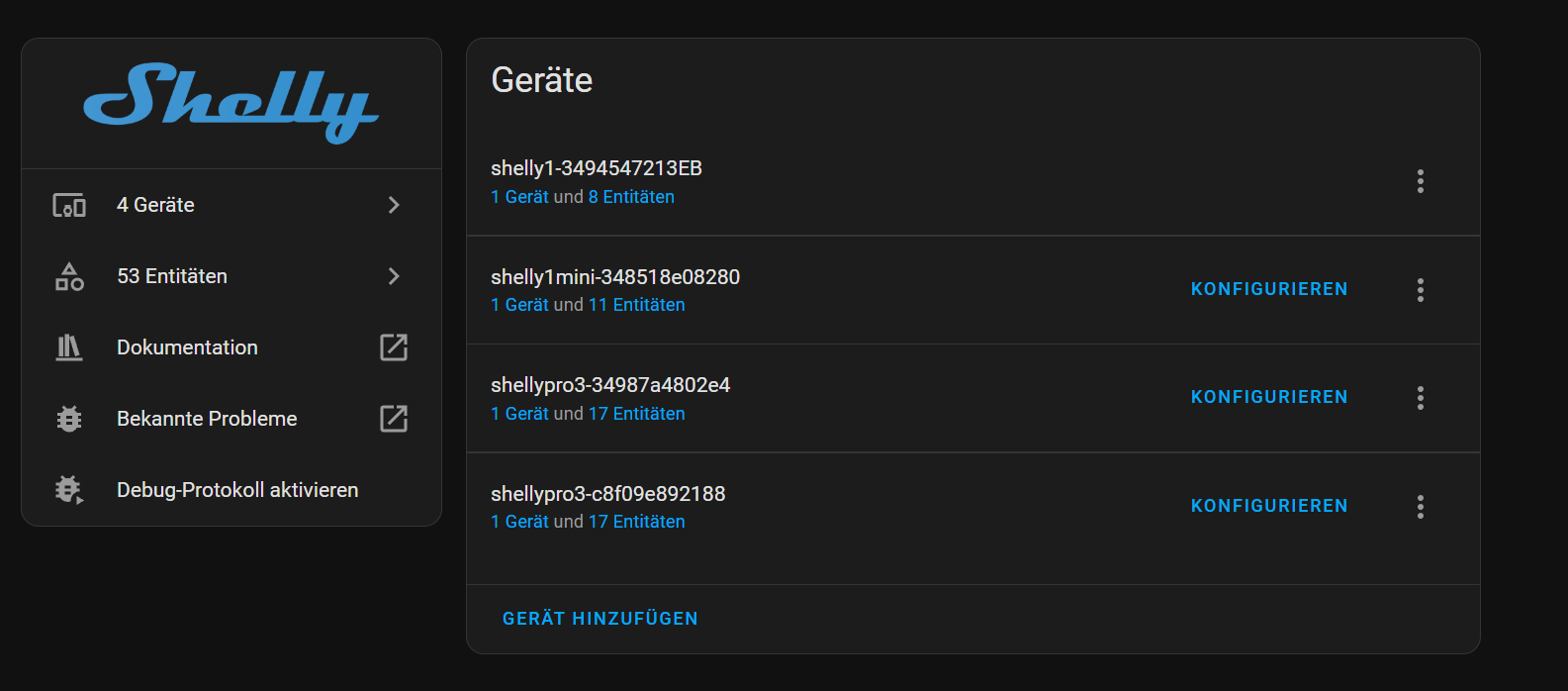 Ebenfalls im HA( Geräte --Shelly) werden alle erkannt. (siehe Fotos).