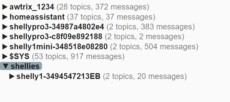 Ich nutze den „Mosquitto broker“ und auch den „MQTT Explorer“, um die Geräte direkt anzuschauen. Ich habe meine Shellys laut Anleitung eingebunden. Der MQTT Explorer zeigt mir auch alle Shellys an (siehe Foto).