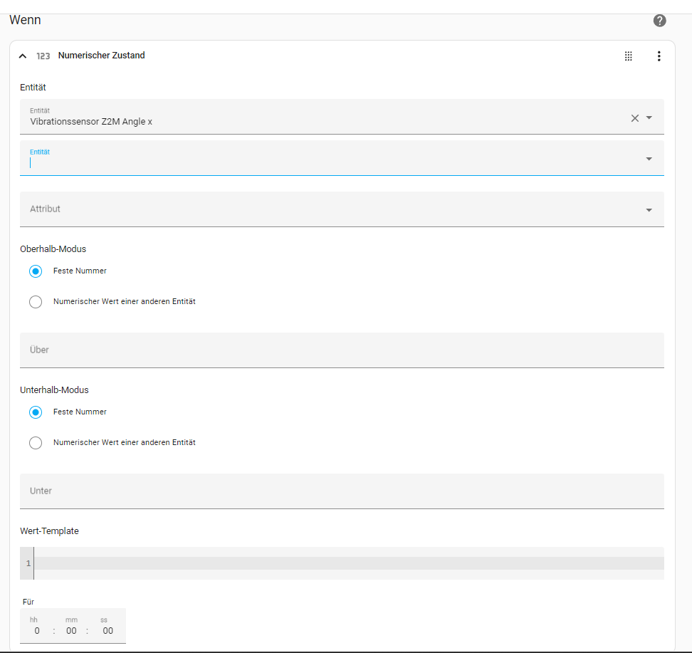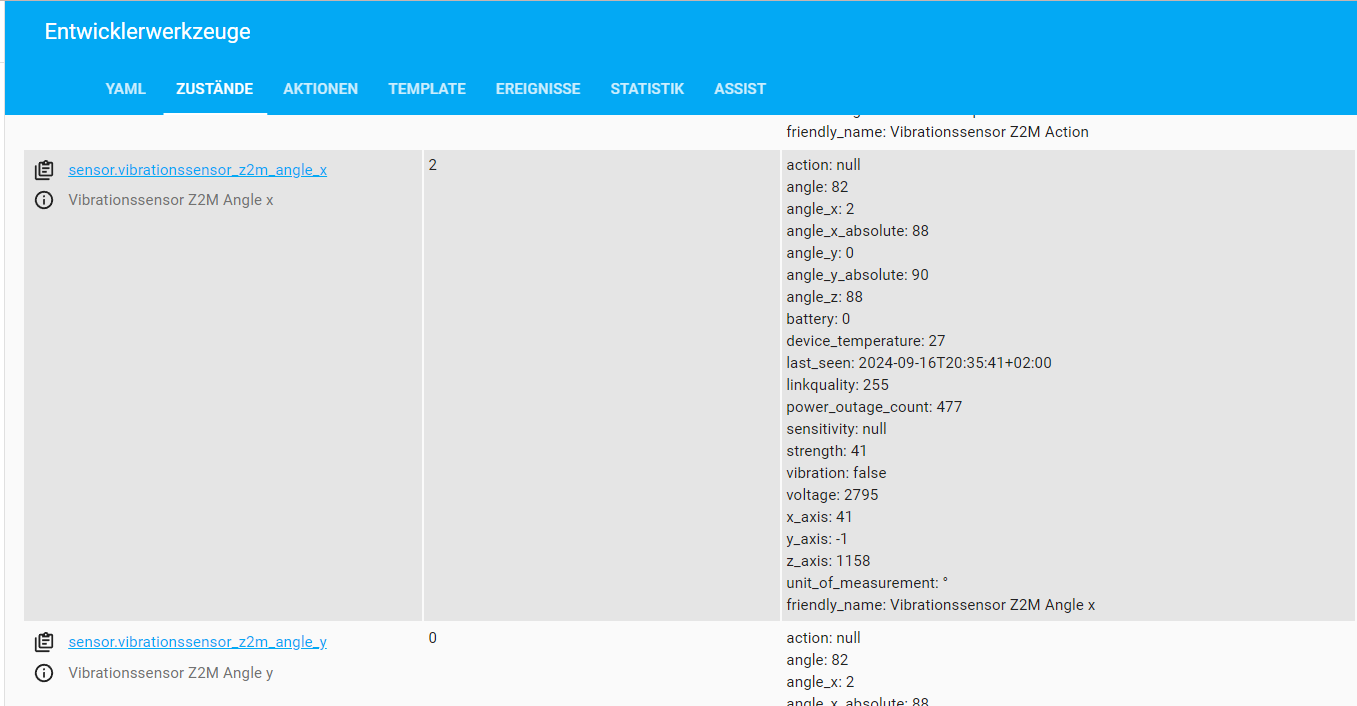 Kurz: ich will die drei Achsen überwachen und dann auslösen, da die Vibration kein guter Indikator ist. Anbei siehst du die Entitäten, die der Sensor zur Verfügung stellt