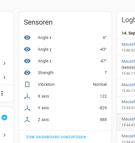 Jetzt erfasst der Vibrationssensor ja die 3 Achsen. Stelle ich die Falle anders auf, müsste ich jedesmal in die Automation und die tatsächlichen, momentanen Werte anpassen. Das möchte ich nicht. Daher dachte ich, über die Automation die Lage zu ermitteln und dann bei der Vibrationserkennung die Veränderung der Achsen zu ermitteln und die Meldung, dass die Falle zugeschnappt hat auszugeben.